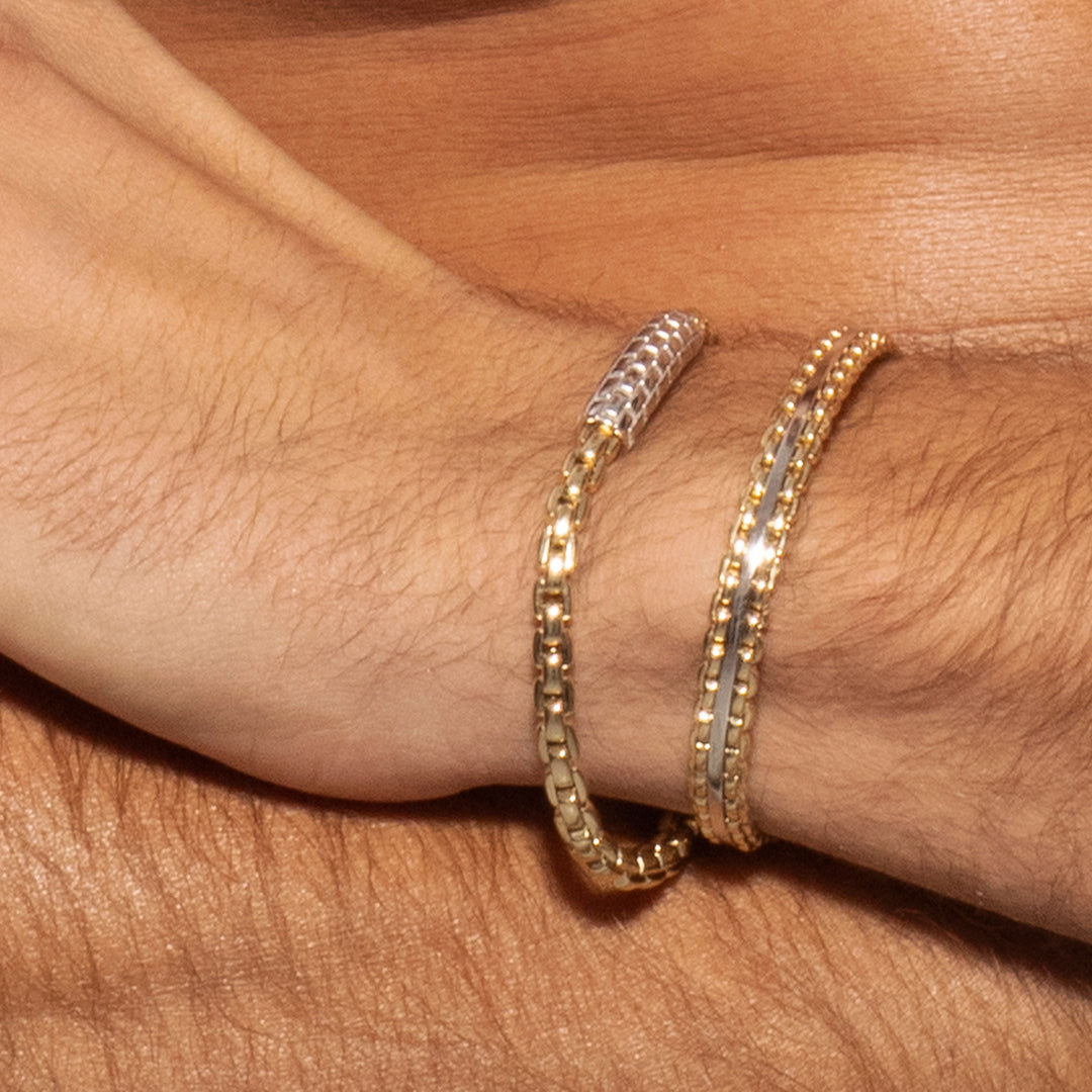 Another highlight is the 14k gold Venetian link cuff bracelet that features interlocking yellow gold links with a white gold bar, meticulously hand-polished for a radiant finish. Its cuff-style design eliminates the need for a clasp and ensures a perfect fit for both men and women.