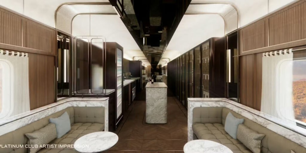 Beyond the private suites, the train offers a range of communal spaces designed to enhance the experience.