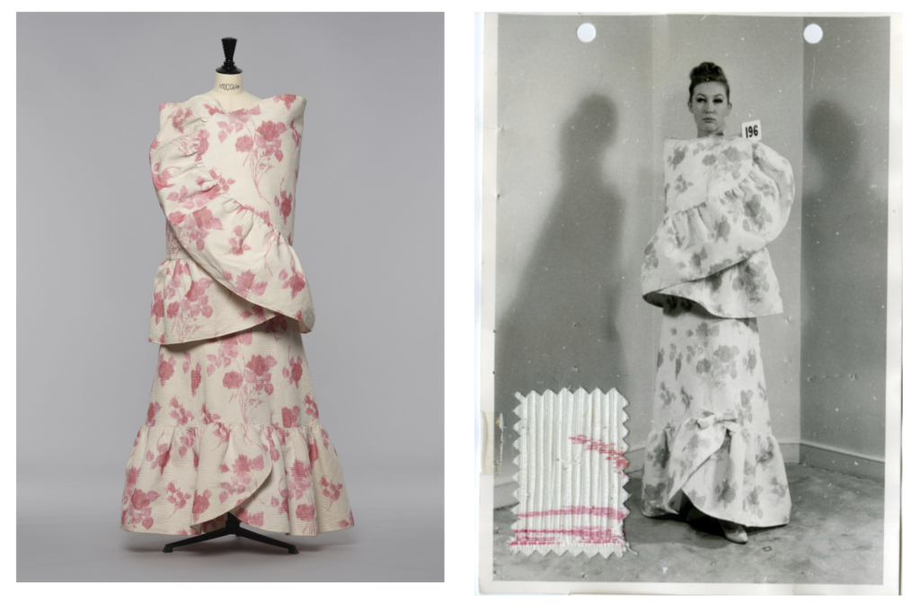 In the Sydney salon, that method is easy to observe. The velvet of Grace Kelly’s dress absorbs light until only contour remains. The white silk of Dietrich’s suit reflects light so that edges read like strokes of a pencil. With the red organza, the eye understands how transparency can still hold shape. Even the smallest elements, a curved seam or a hidden fastening, show intention. Nothing is louder than it needs to be. Everything is in service of form.