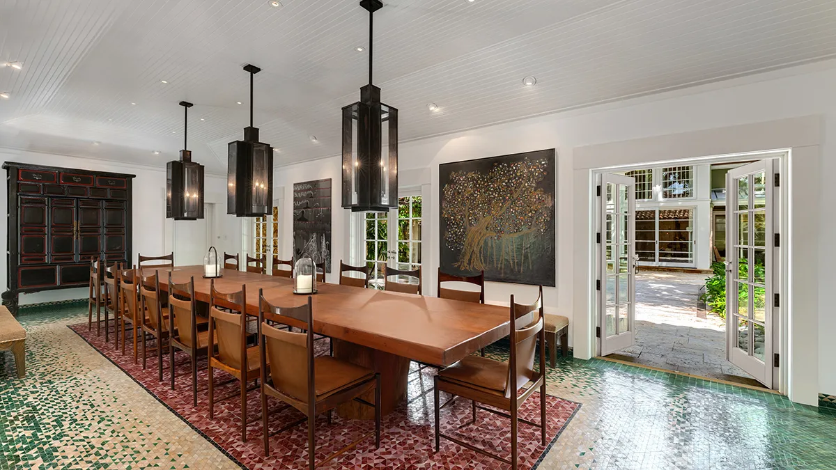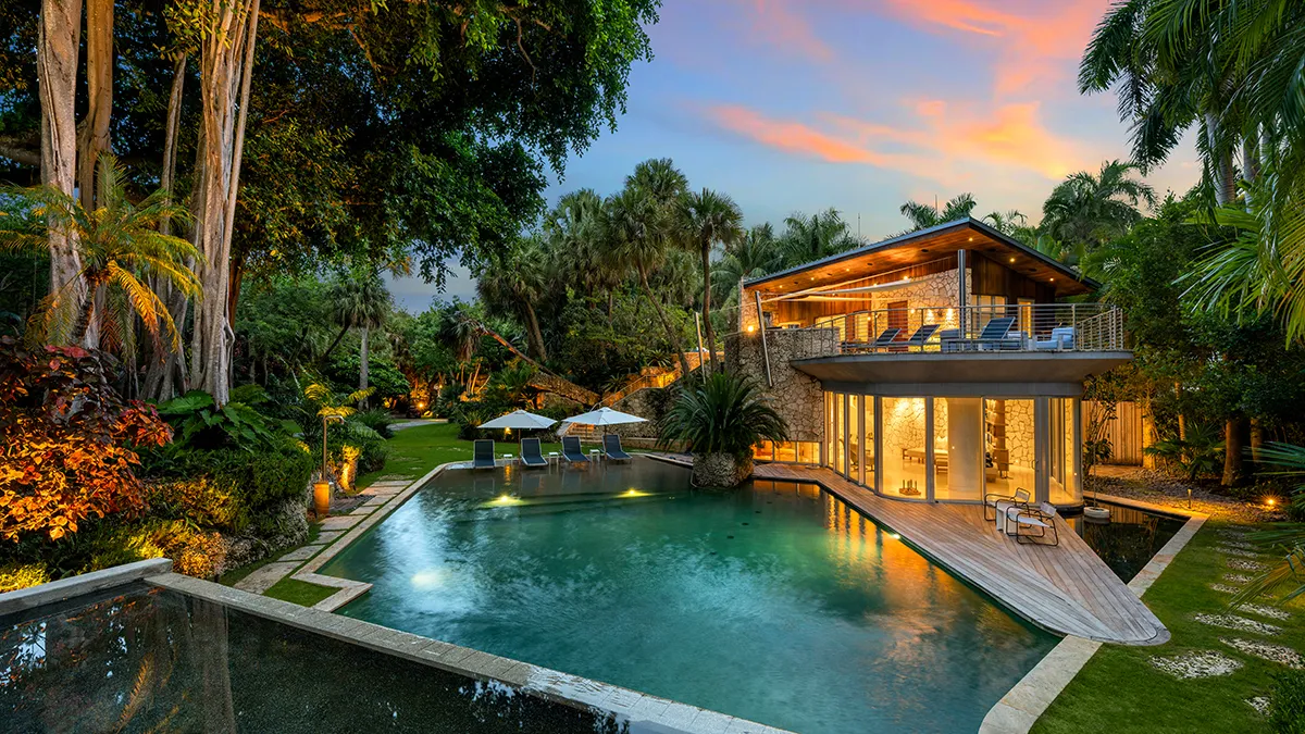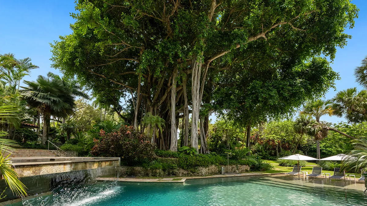 The landscape, crafted by celebrated designer Raymond Jungles, is a lush symphony of cascading waterfalls, koi ponds, and natural stone pathways that weave through palms, banyans, and exotic flora. It is a garden conceived for serenity as much as beauty, with each turn of the trail unveiling a new vignette. A meditation garden tucked behind sculptural foliage, an open courtyard washed in sunlight, and hidden seating nooks beside quiet reflecting pools all contribute to an atmosphere of deep calm.