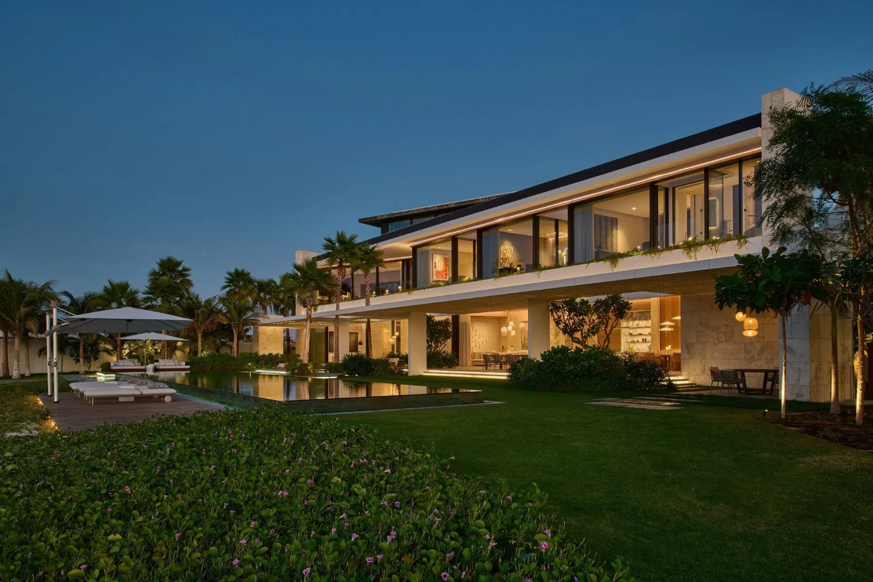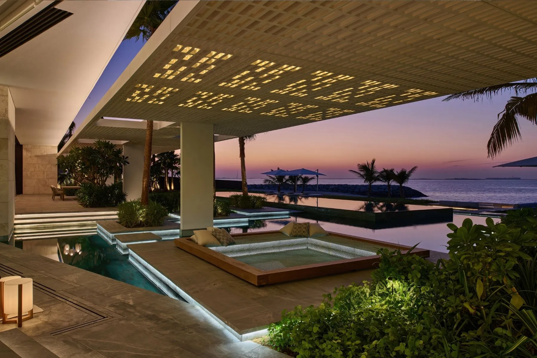 Stepping outside reveals a landscape that feels more like a private resort than a residence. A resort-style infinity pool reflects the endless blue of the Arabian Gulf, surrounded by lush gardens that lead to a pristine private beach.