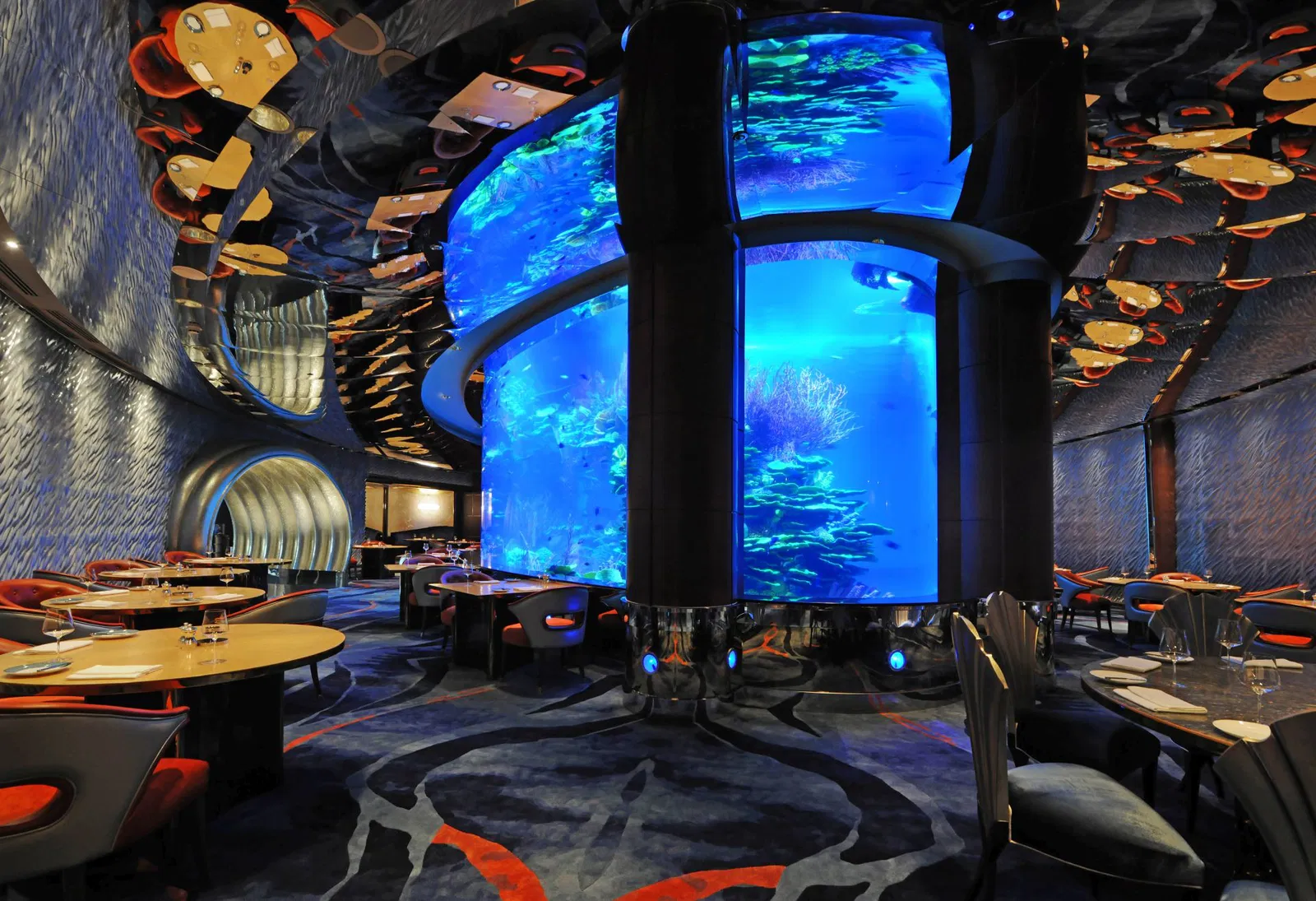 Located inside the sail-shaped Burj Al Arab, often referred to as the world’s only seven-star hotel, Al Mahara promises much more than a meal. The moment you step into the restaurant, you’re greeted by an enormous floor-to-ceiling aquarium that encircles the dining room, giving the illusion of dining beneath the sea. Exotic marine life swims past as you enjoy your meal, creating a serene and enchanting atmosphere that feels completely removed from the bustling city above.