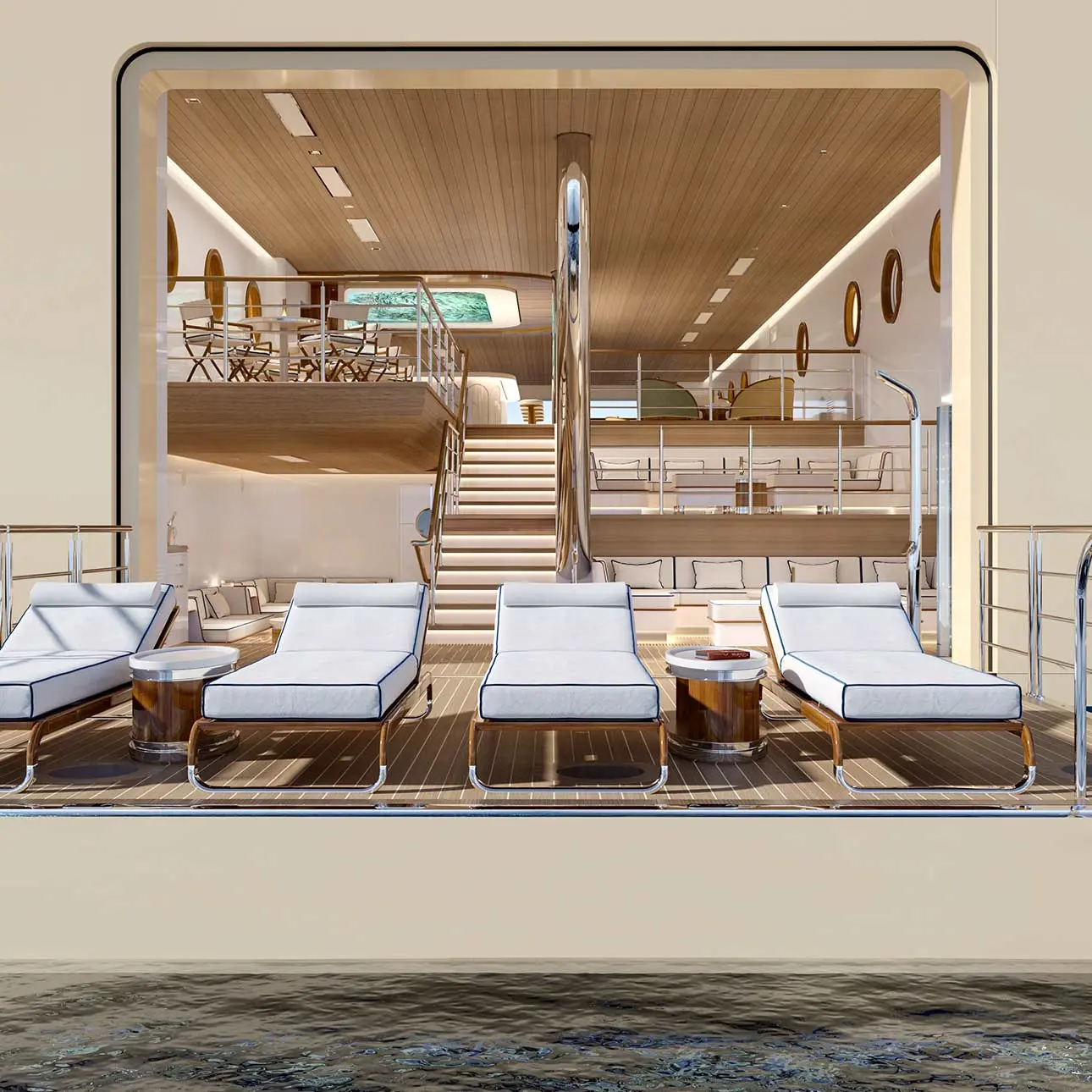 Unlike traditional yachts, Four Seasons 1 delivers the amenities of a land based resort. A 66 foot swimming pool anchors the outdoor deck, while the transverse marina introduces a transformative feature that opens the vessel directly to the water. When deployed, it creates expansive platforms on both sides of the yacht, allowing guests to swim, lounge, or launch watercraft with ease.