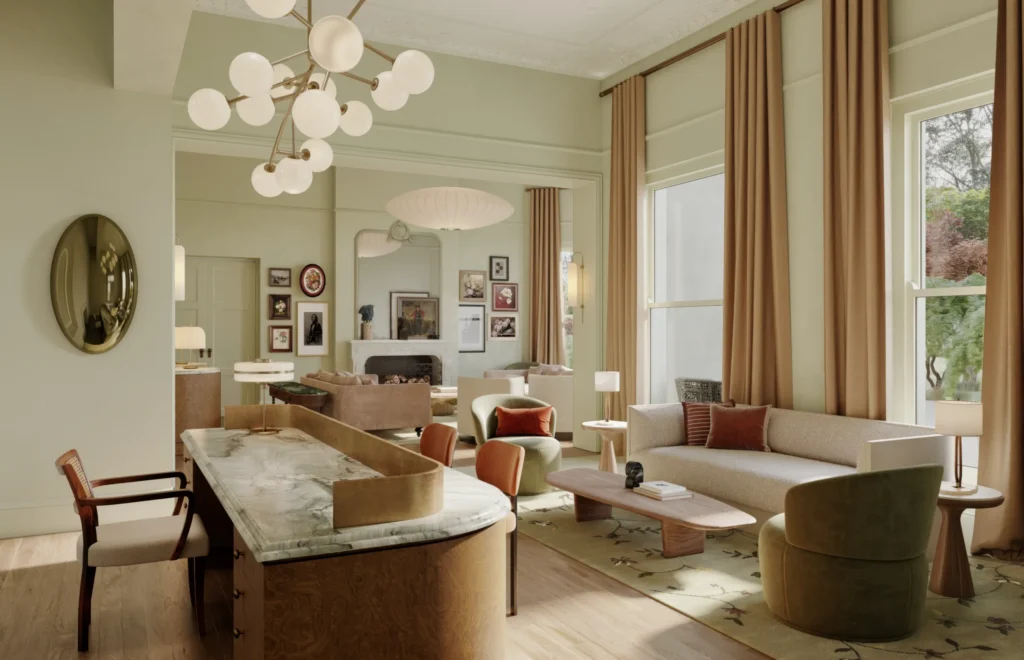 Each room will be layered with tactile finishes including brushed brass, oak timber, marble and soft wool carpet. Restored vintage furnishings will sit alongside custom joinery, while curated minibars will feature local produce and fine spirits. A mural referencing the estate’s iconic weeping beech tree will adorn each room, a quiet tribute to the gardens that surround it.